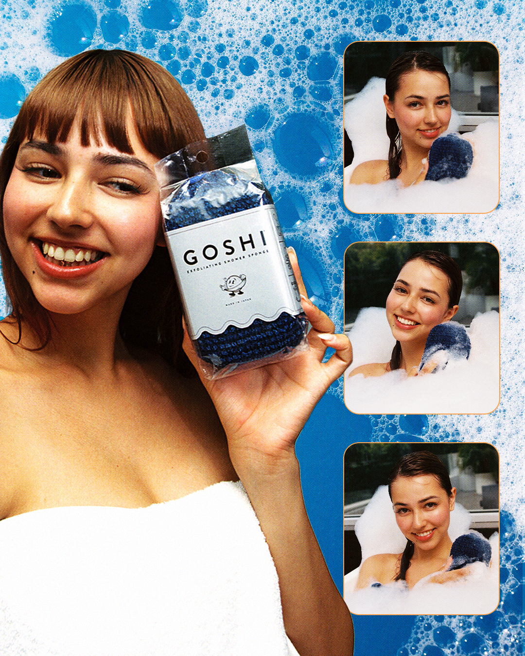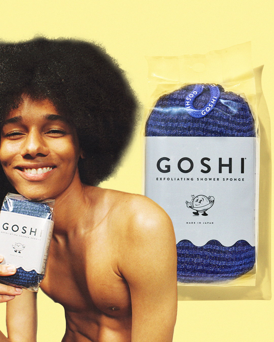 - Add your favorite liquid body soap to GOSHI and work into a generous lather.